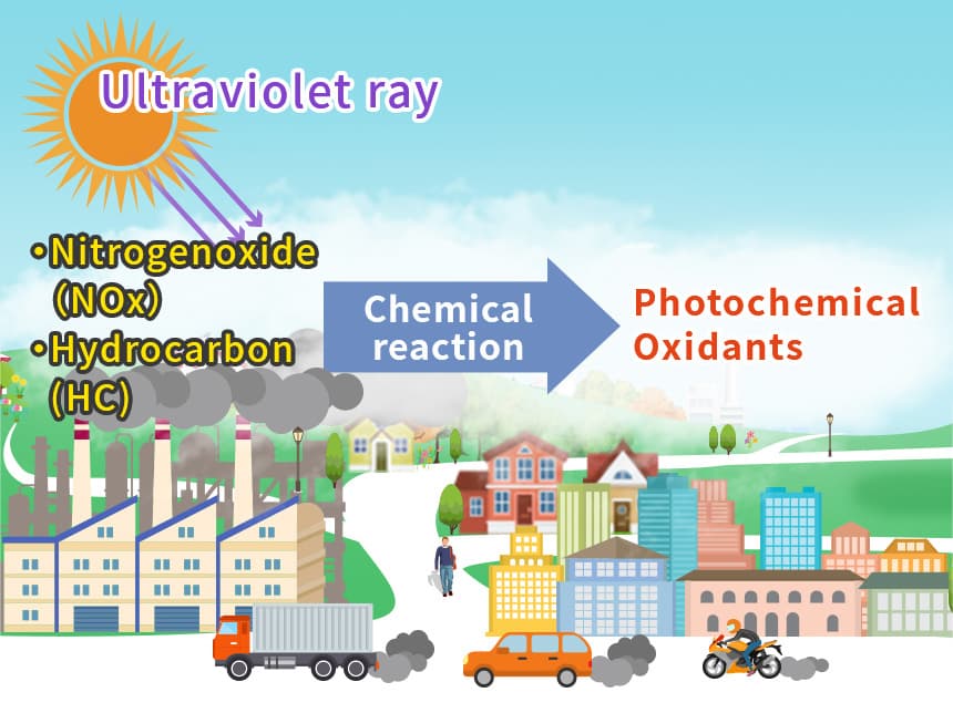 Nitrogen oxides (NOx) emitted from automobiles and factories, and hydrocarbons (HC) contained in gasoline and paint thinner are exposed to the sun's strong ultraviolet rays and transformed into new substances called photochemical oxidants (Ox) through photochemical reactions. Photochemical oxidants have a high concentration of HC and NOx in the atmosphere, and when the ultraviolet rays are strong, they appear white and hazy. This phenomenon is called "photochemical smog", and when the concentration becomes high, it affects people and plants. Effects on the human body include those reported for mucous membranes of the eyes and throat, such as "flickering eyes", "sore throat", and "difficulty breathing".